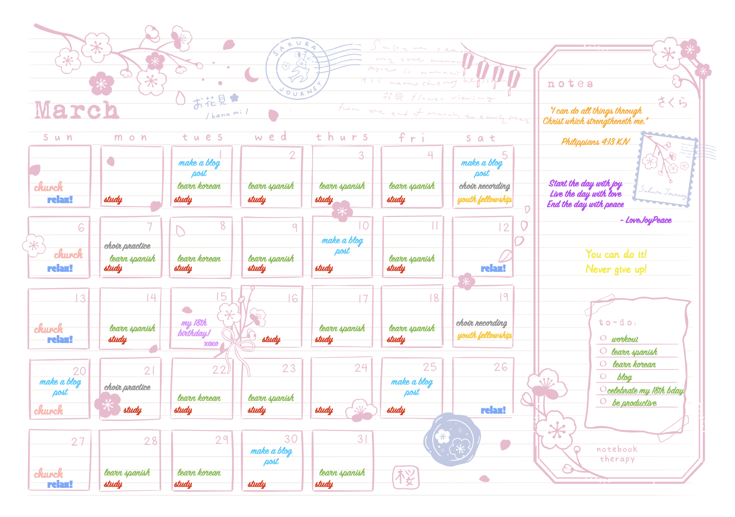 ~ just a simple schedule of the month of March for me! ( I love this calendar from Notebook Therapy heheh )